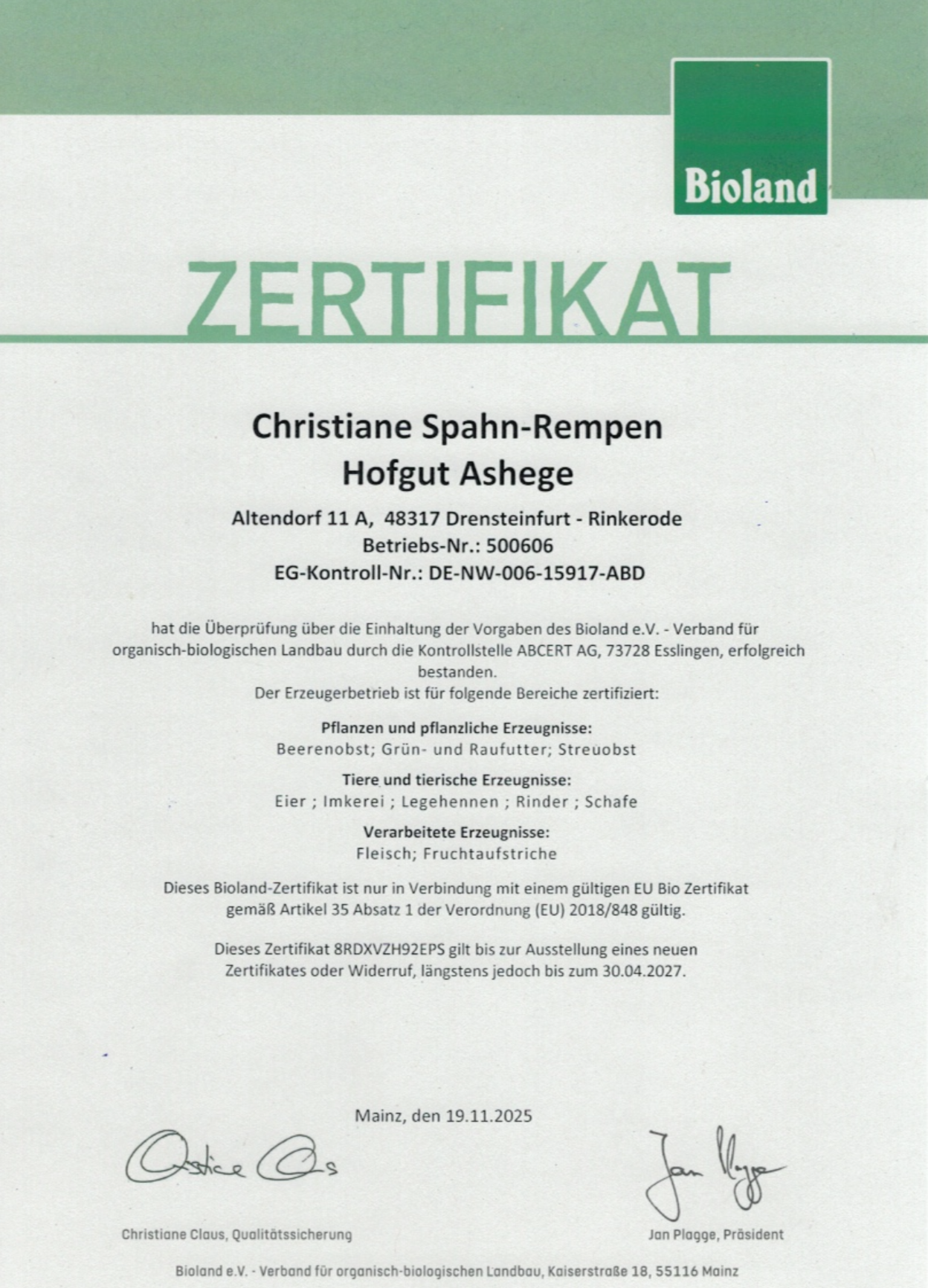 Dieses Unternehmen hat die Überprüfung über die Einhaltung der Vorgaben des Bioland e.V. – Verband für organisch biologischen Landbau erfolgreich bestanden.